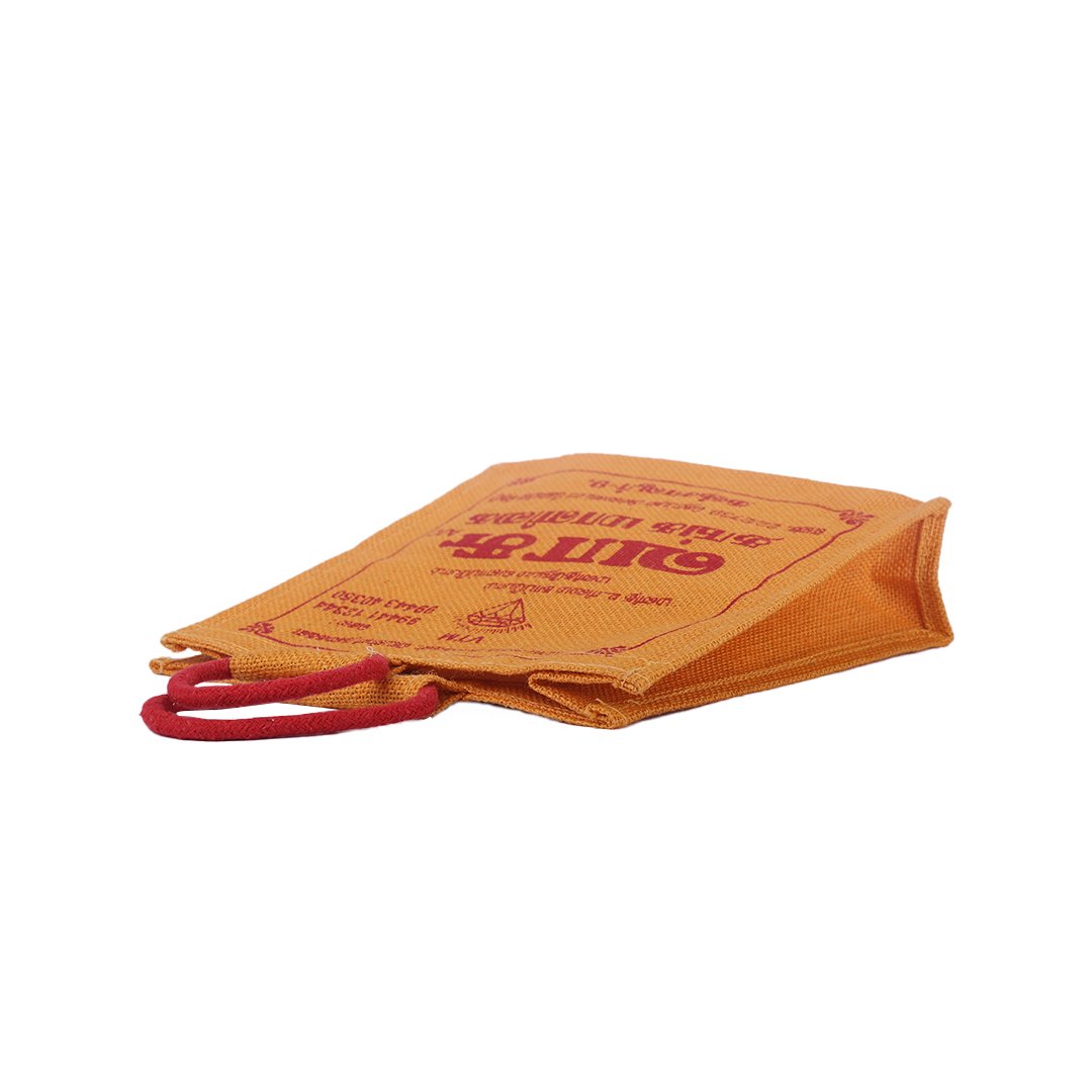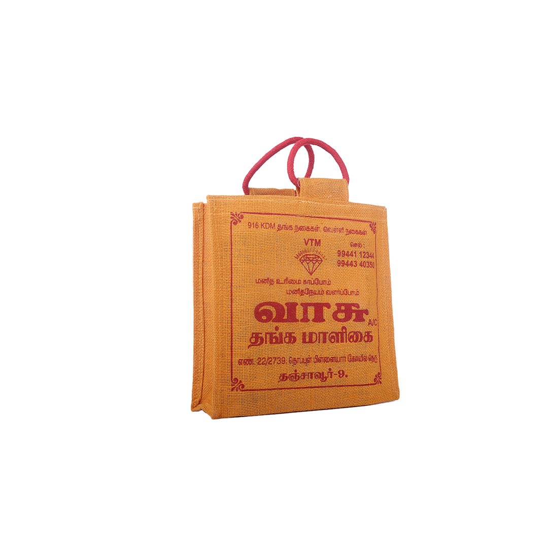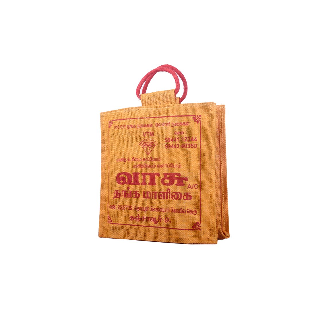 Vibrant and durable, this orange jute carry bag features a bold custom brand print in Tamil, perfect for retail and promotional use. Made from premium-grade natural jute, it’s designed to be sturdy, reusable, and eco-friendly. The contrasting red handles ensure easy carrying, making it an excellent choice for jewellery shops, boutiques, or local businesses.