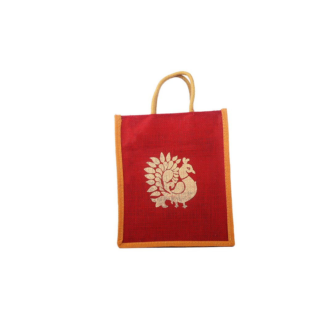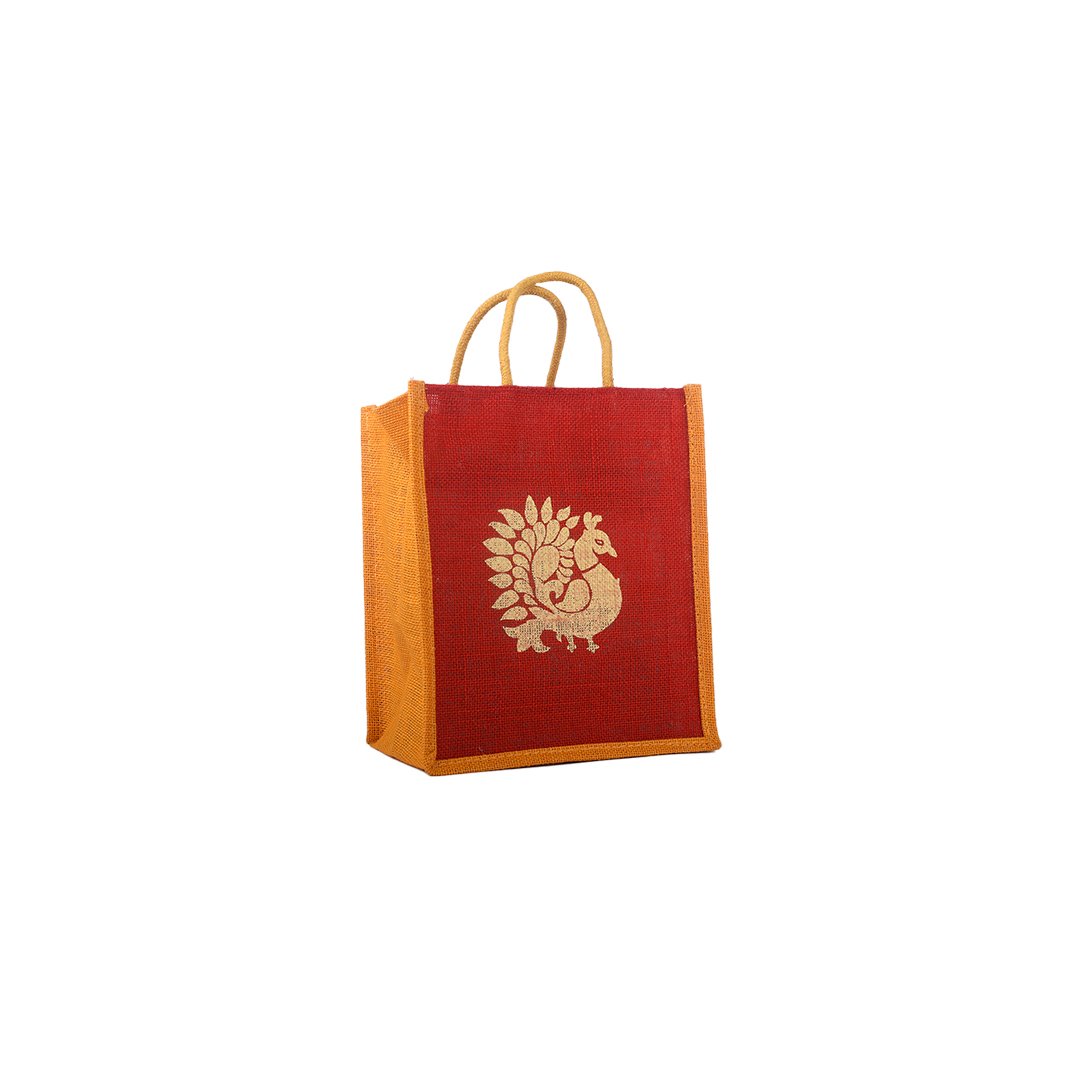 Elegant and eco-friendly, this dual-tone handcrafted jute bag features a rich red front panel with a traditional golden peacock print, beautifully complemented by orange sides and borders. Made from premium-quality natural jute, it combines durability with timeless Indian artistry — perfect for gifting, festive packaging, or daily use.