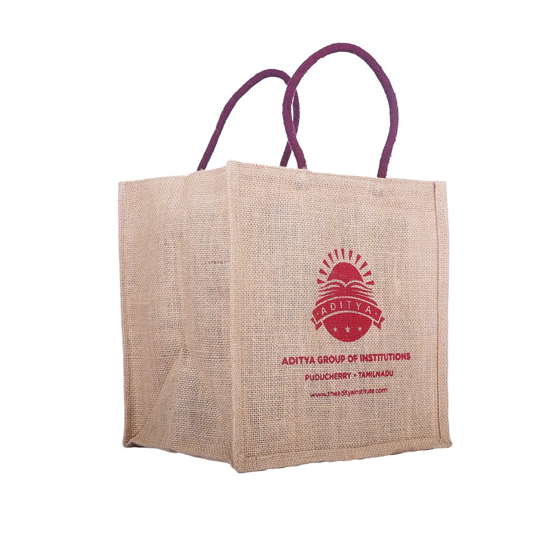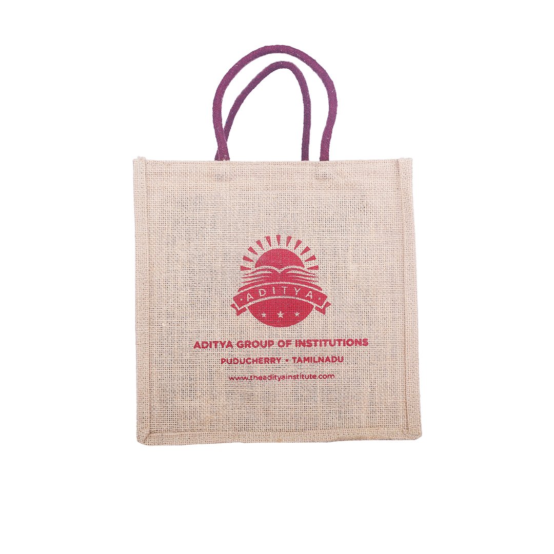 This eco-friendly beige jute bag is designed exclusively for Aditya Group of Institutions, combining functionality with a clean, professional look. The red institutional logo and typography stand out elegantly on the natural jute texture, while the maroon rope handles ensure easy carrying. Crafted from durable and sustainable materials, this bag is perfect for academic events, seminars, and conferences.