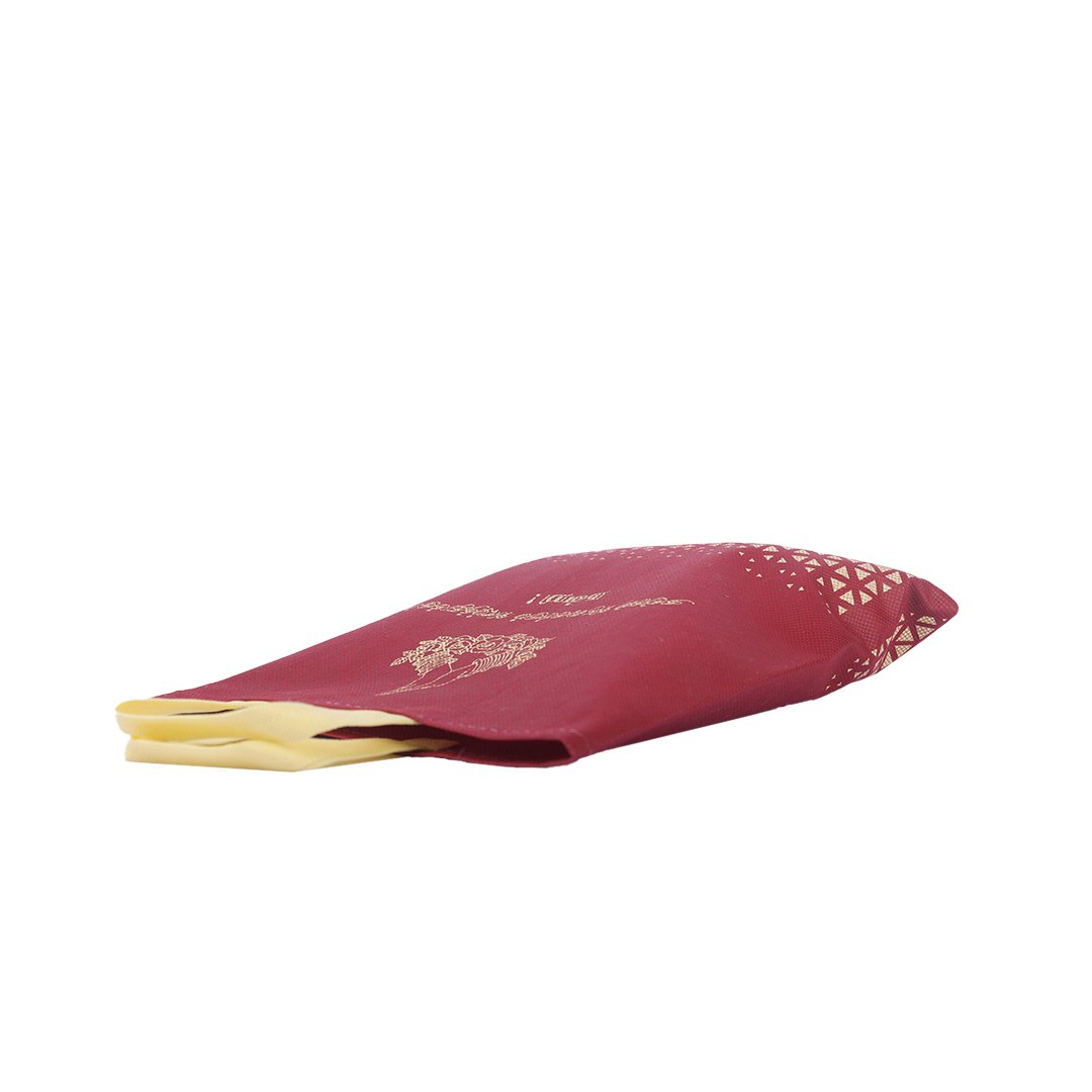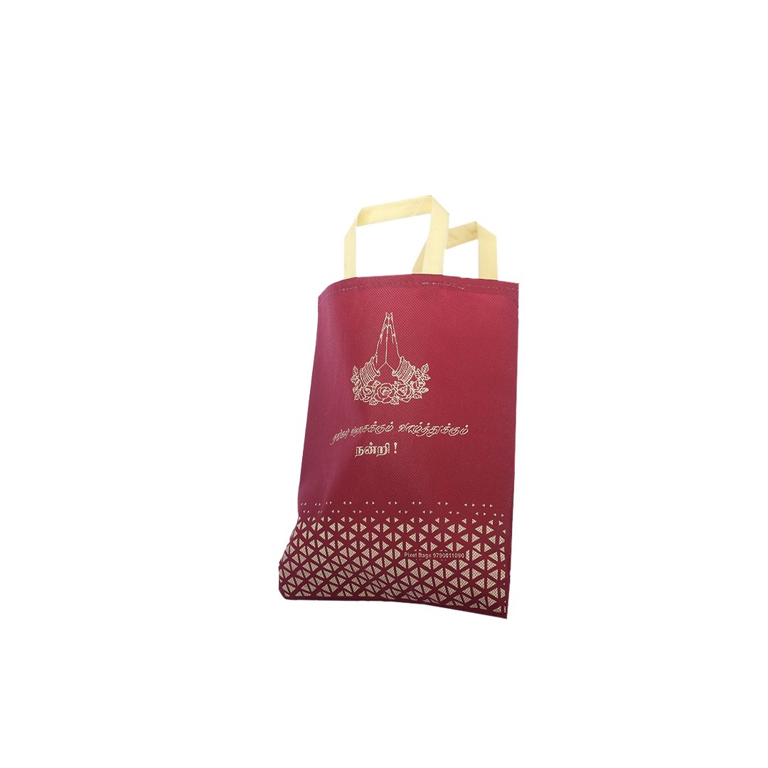 Graceful and eco-friendly, this maroon non-woven carry bag features a golden printed design with folded hands and Tamil text, symbolizing gratitude and respect. Crafted from durable, lightweight material with contrasting beige handles, it’s perfect for events, gifting, or return favors. A thoughtful blend of tradition, utility, and sustainability.