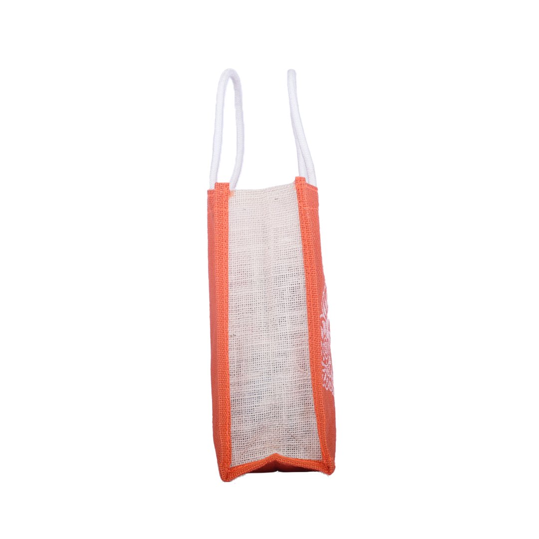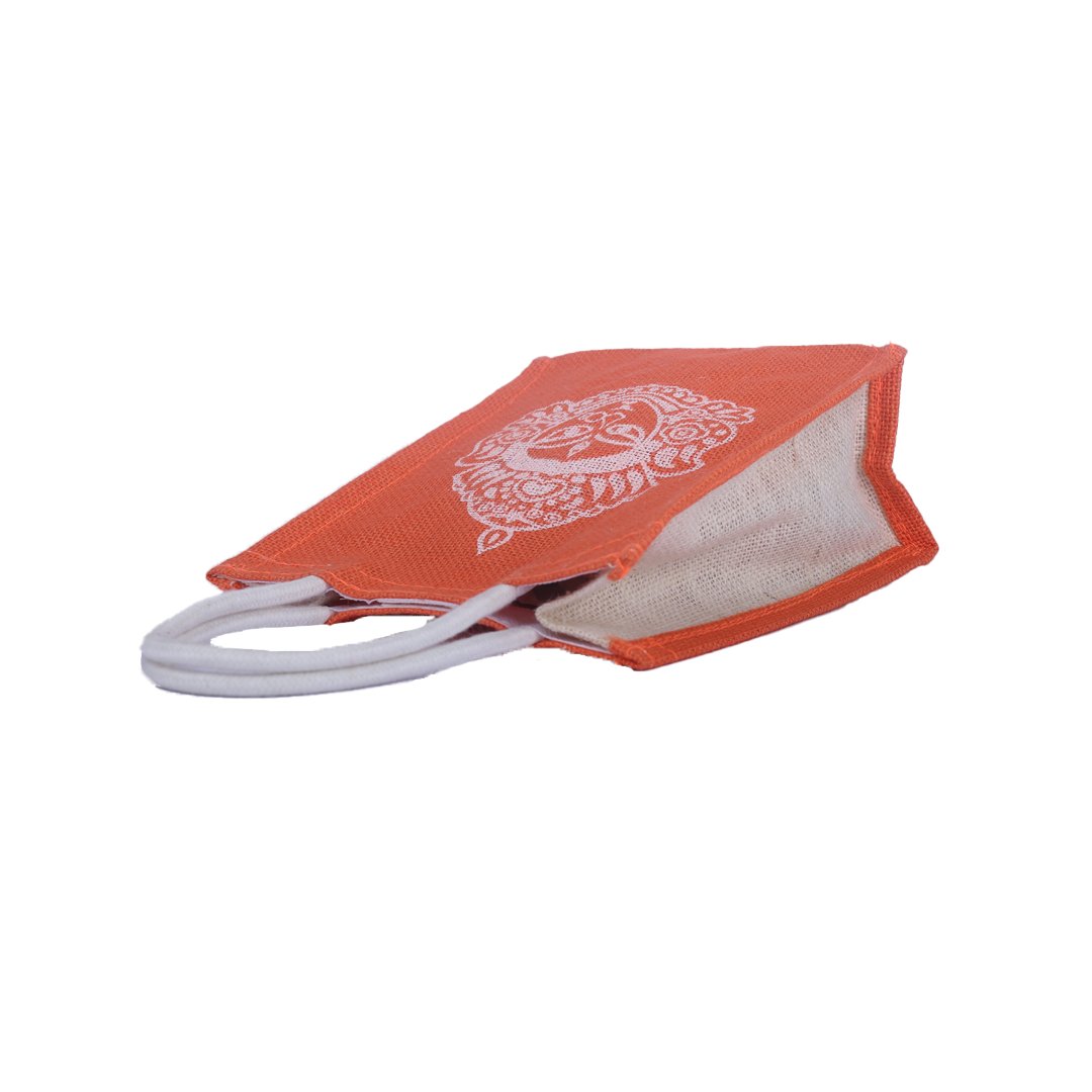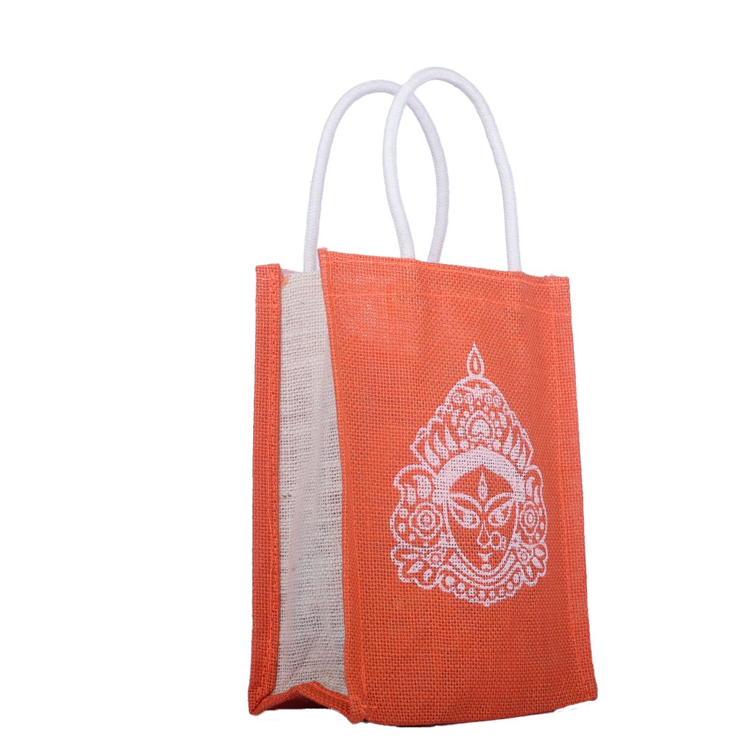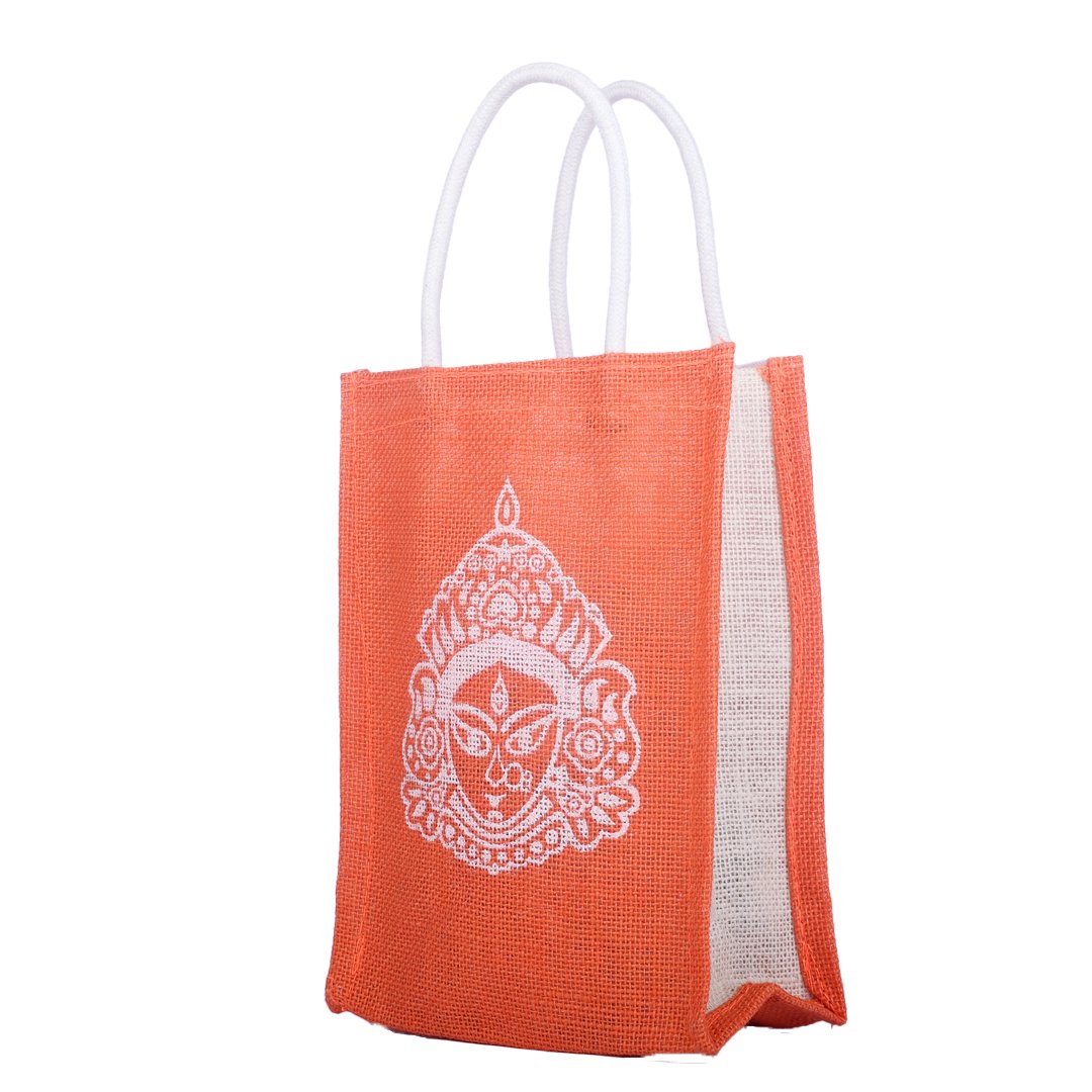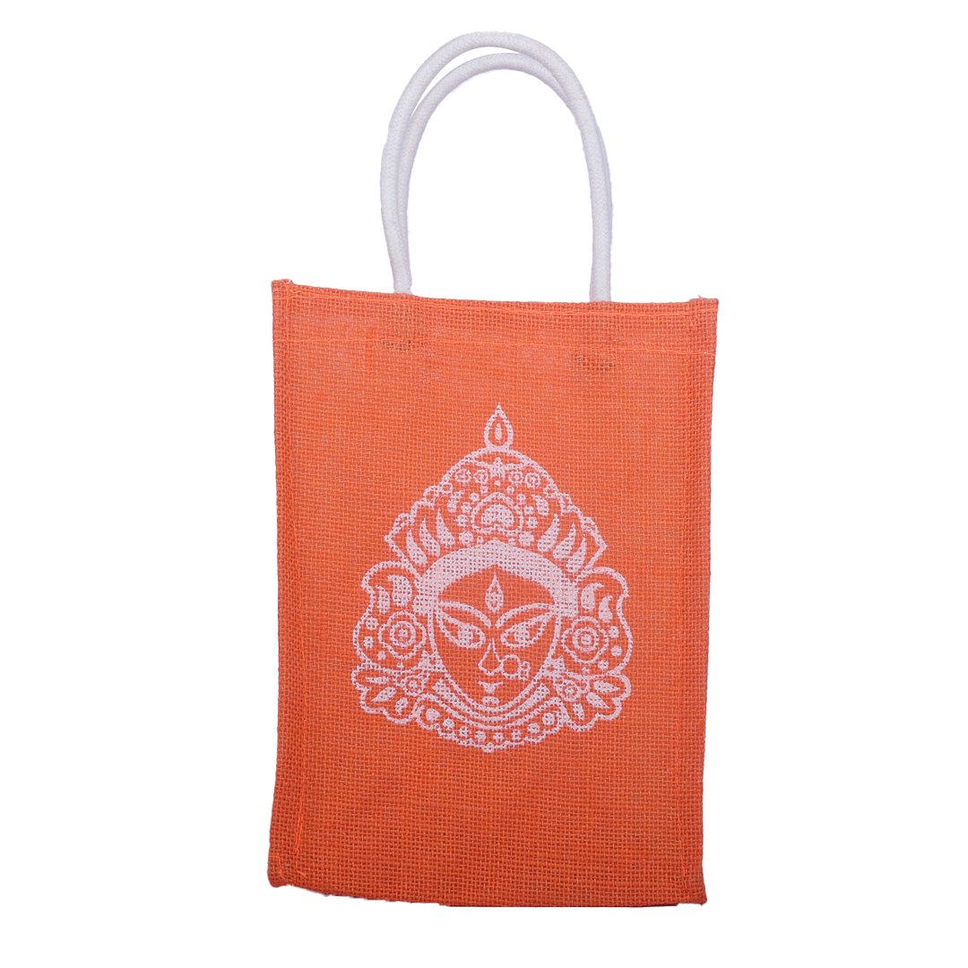 Celebrate tradition with this vibrant orange jute bag, adorned with an elegant white Durga face print symbolizing power and grace. Crafted from premium natural jute, it’s durable, eco-friendly, and perfect for festive gifting or spiritual events. The white rope handles add a refined contrast and comfortable grip.