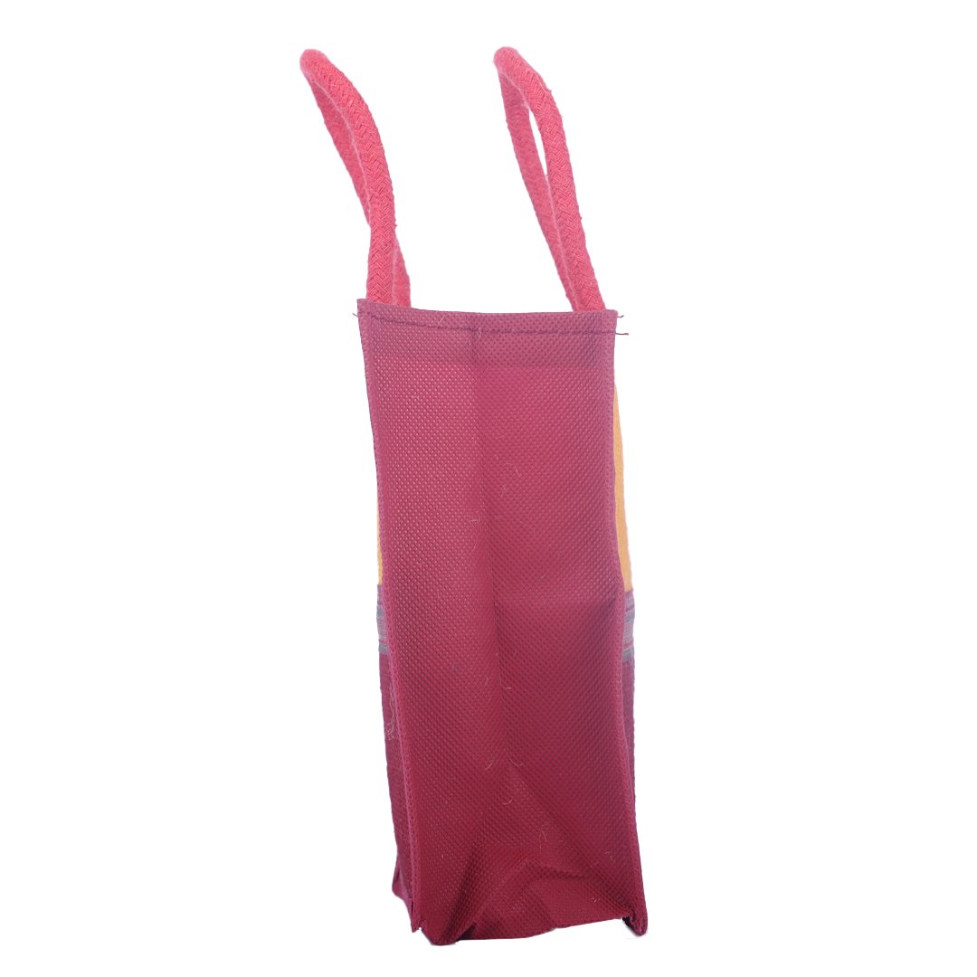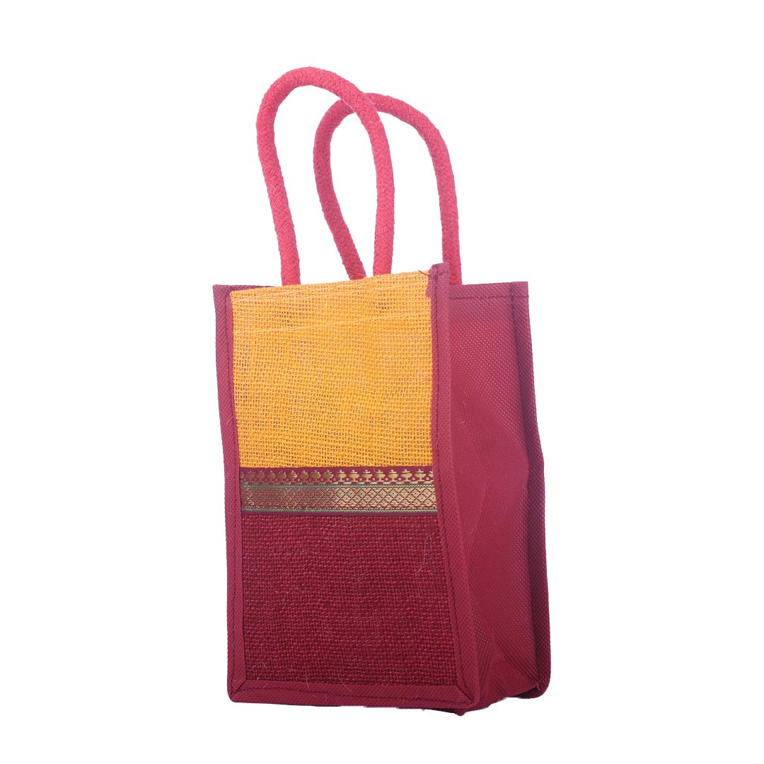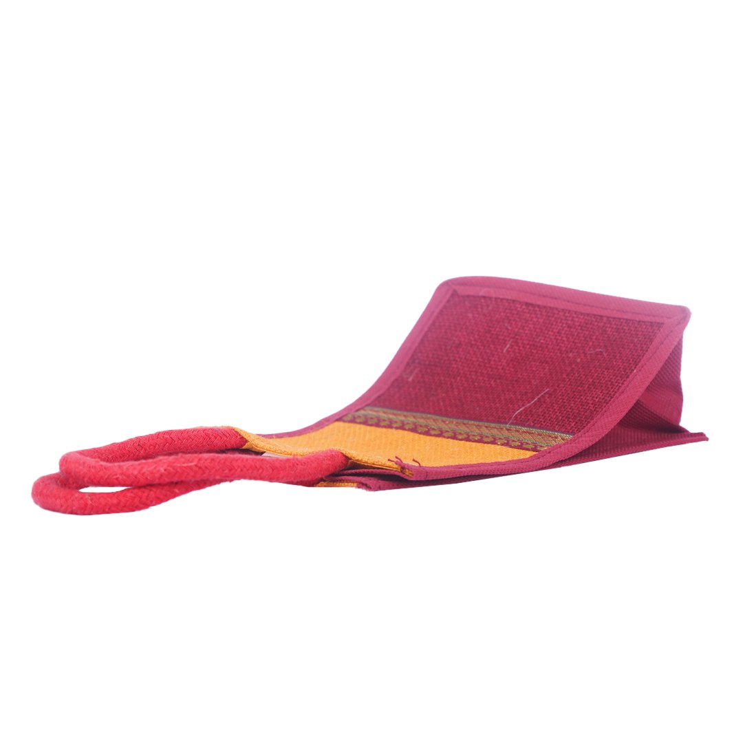 A perfect blend of tradition and sustainability, this dual-tone jute bag features a striking orange and maroon combination highlighted with a golden ethnic lace border. Handcrafted from premium natural jute with sturdy handles, it’s durable, eco-friendly, and ideal for gifting, festive occasions, or retail packaging.