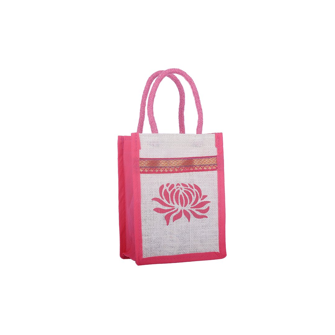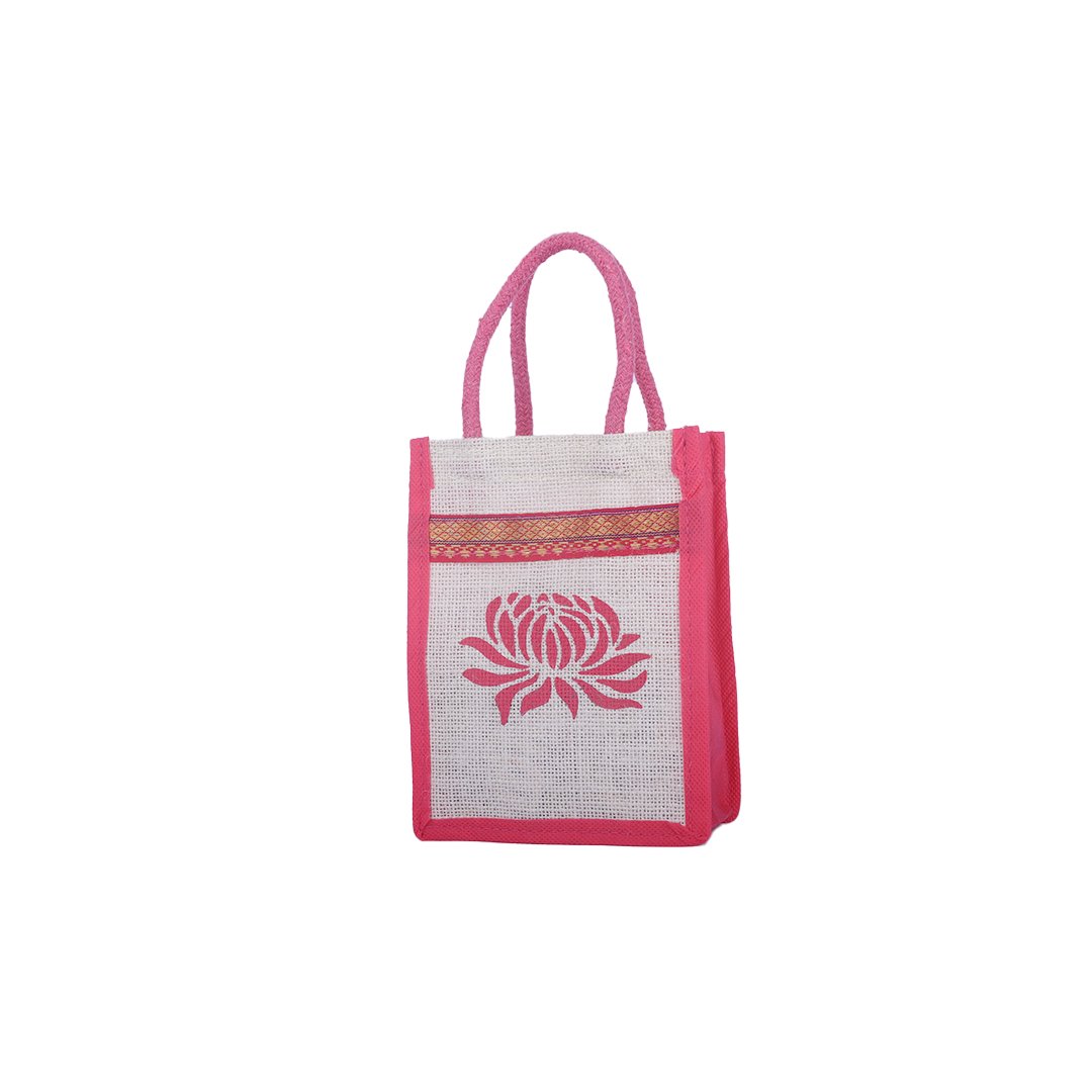 Graceful, eco-friendly, and handcrafted — this pink-bordered jute bag features a stunning white lotus print with a golden ethnic border, adding a festive charm to sustainable style. Made from high-quality natural jute, it’s lightweight yet sturdy, perfect for gifting, events, or everyday use.