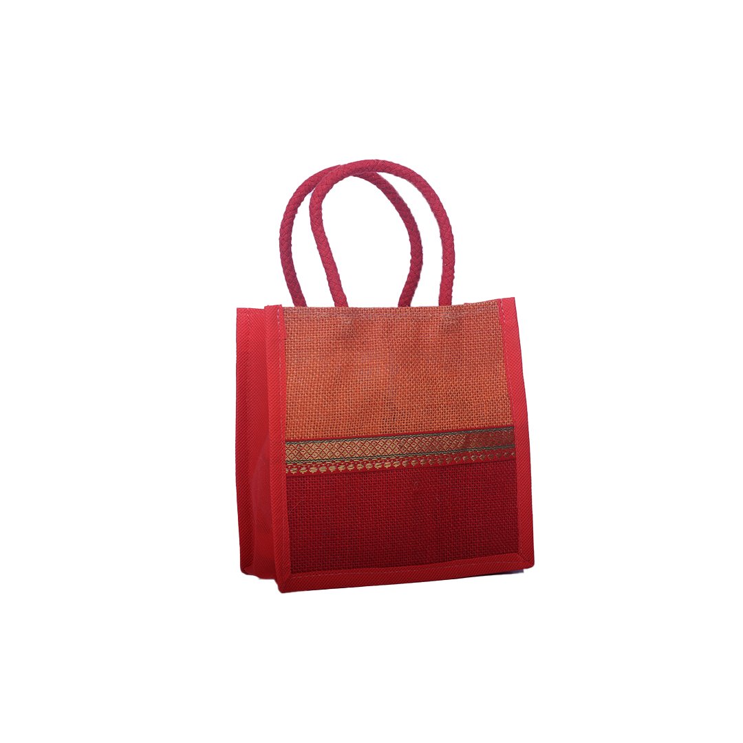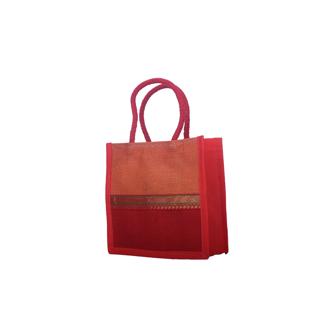 Make a vibrant eco-statement with this dual-tone handcrafted jute bag. Designed in rich shades of red and orange, it features a traditional golden border for a touch of ethnic charm. Durable, reusable, and lightweight — it’s perfect for gifting, festive occasions, or daily carry.