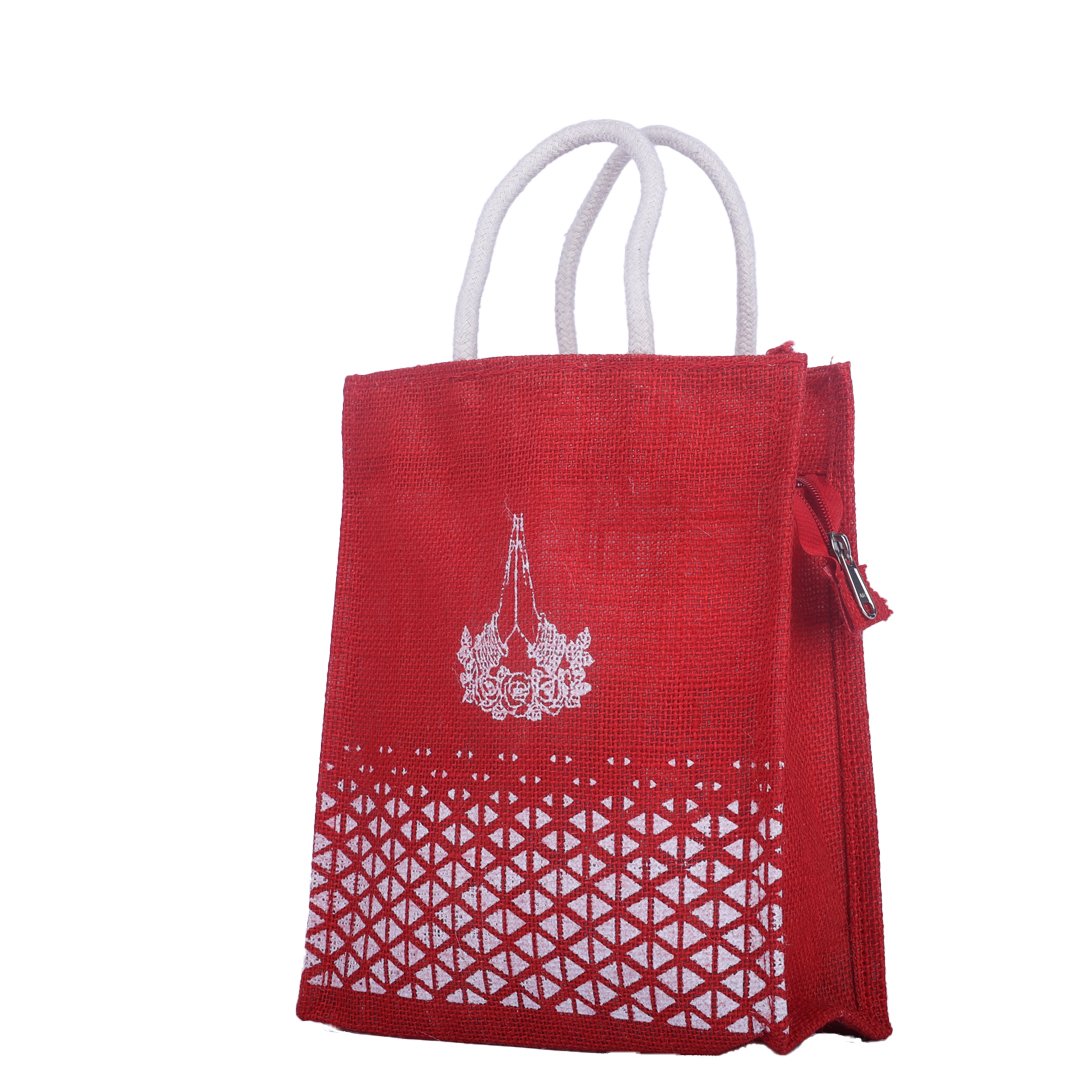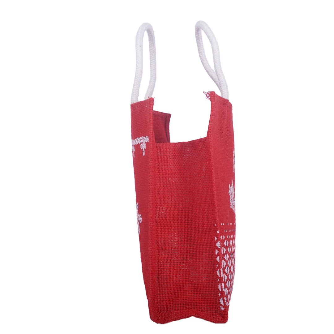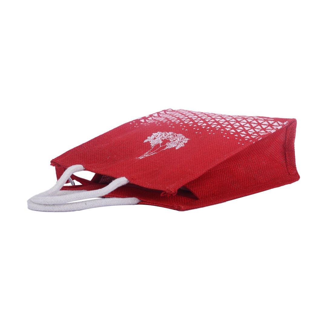 Elegant and expressive, this red jute bag features a graceful folded-hand “Thank You” motif and a detailed geometric white print along the bottom for added charm. Handcrafted from premium natural jute, it’s durable, eco-friendly, and perfect for return gifts, events, and festive giveaways.