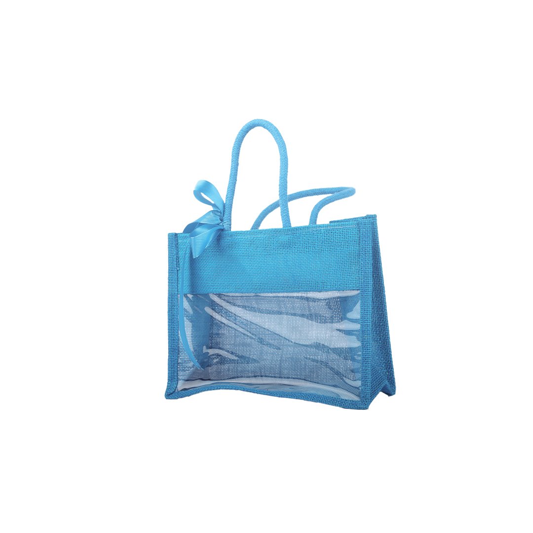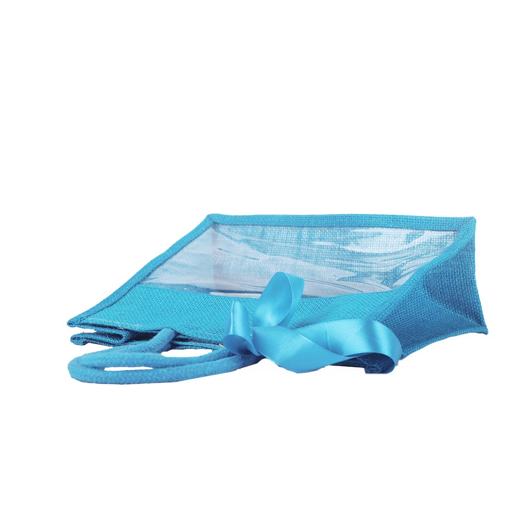 Delicate, charming, and eco-friendly — this sky-blue jute bag features a transparent front panel and a decorative satin ribbon, adding a touch of elegance to sustainability. Crafted from natural jute with a modern see-through design, it’s perfect for gifting, hampers, or boutique packaging. Lightweight yet durable, it blends beauty with purpose.
