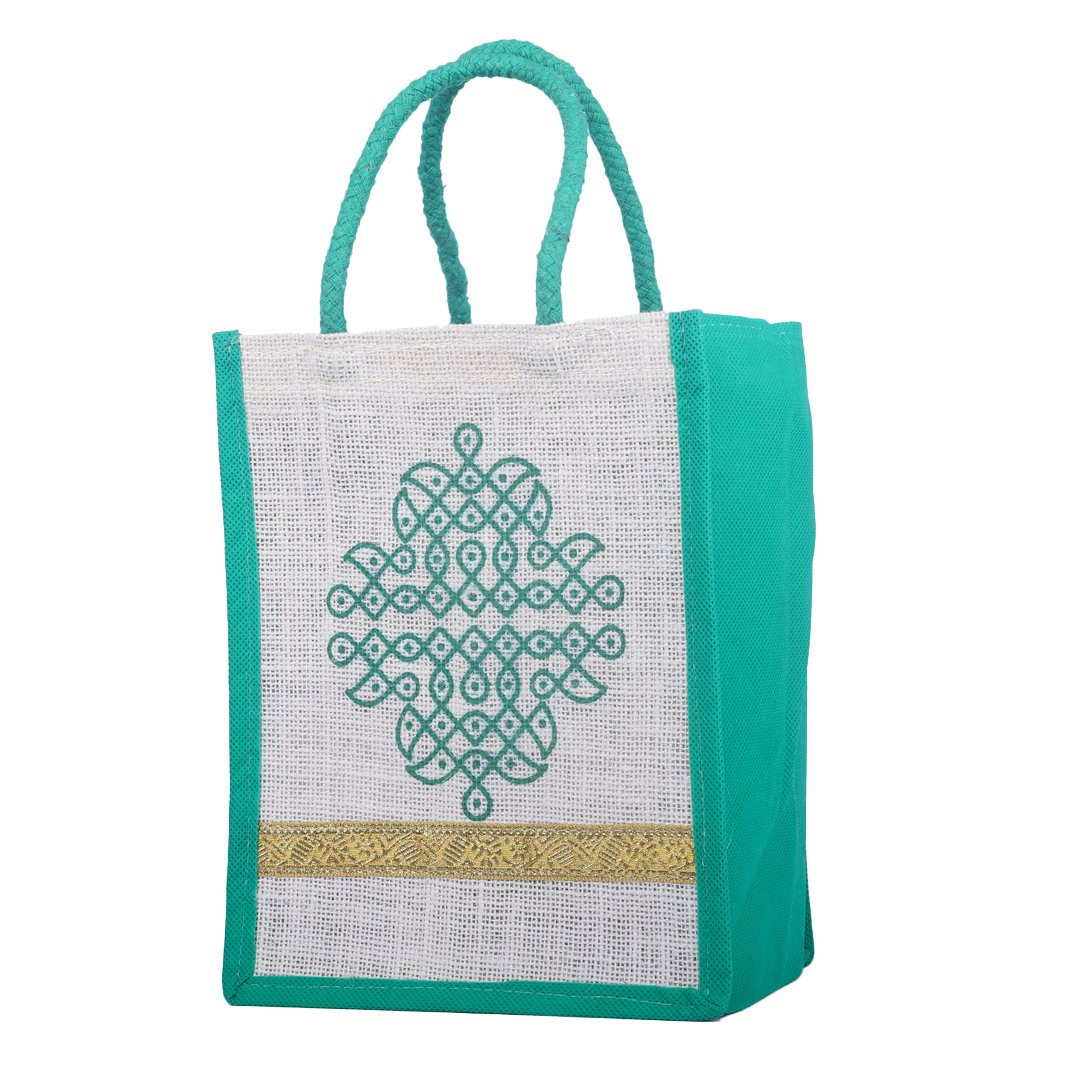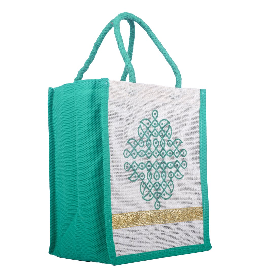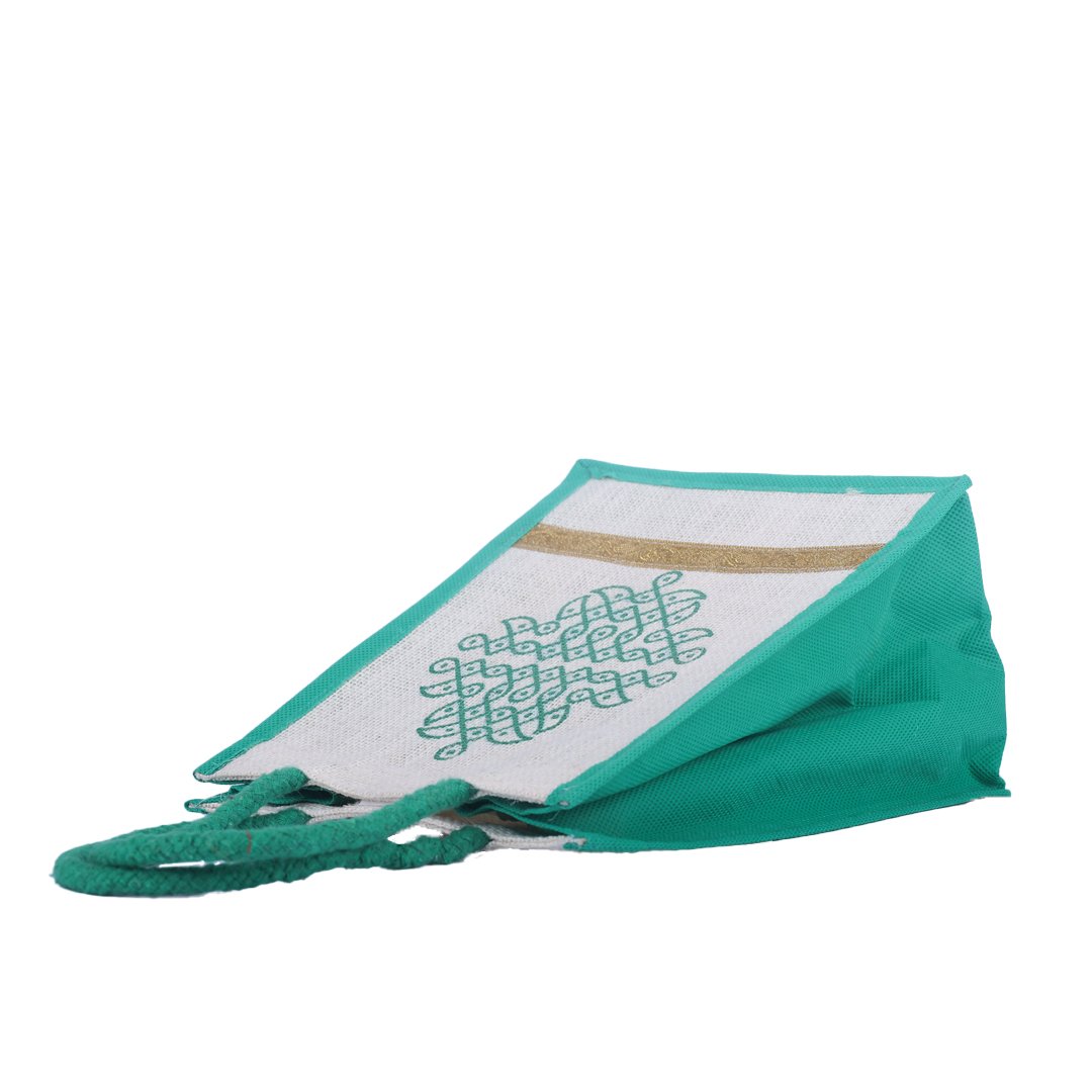 Sophisticated and sustainable, this white jute bag with green patterned print exudes elegance and eco-conscious charm. Accented with a golden lace border and contrasting green sides and handles, it’s handcrafted from premium natural jute for durability and style. Ideal for festive gifting, shopping, or event packaging.