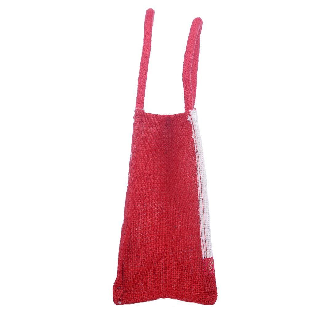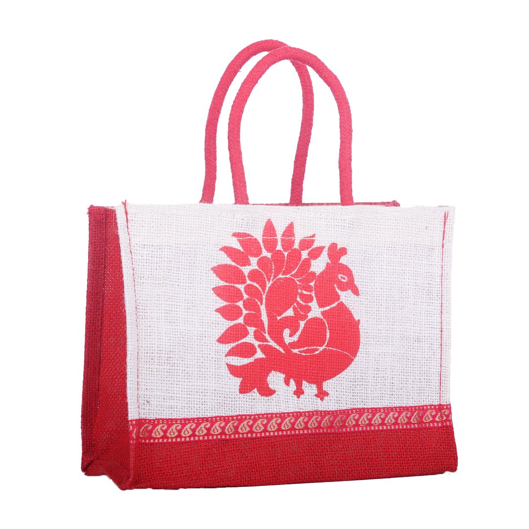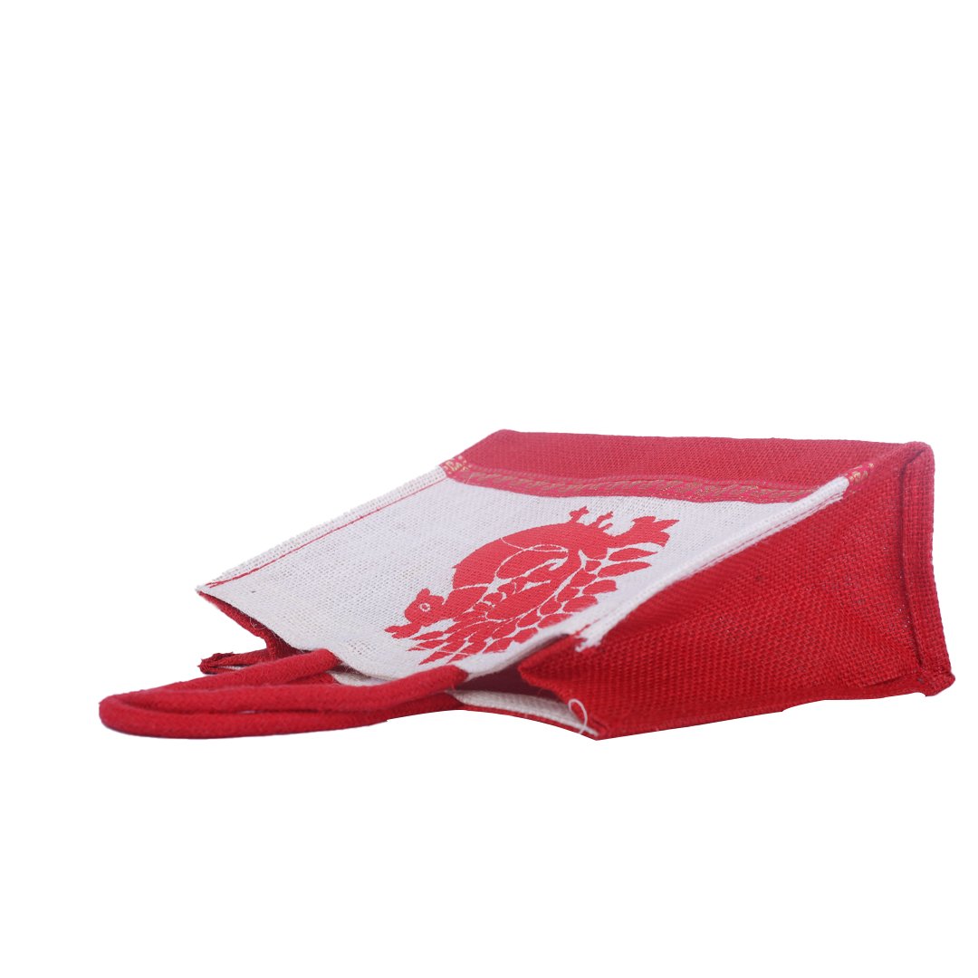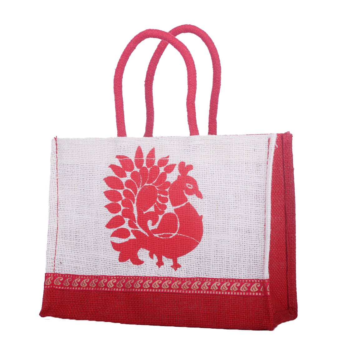 Graceful and eco-friendly, this white jute bag with a vibrant red peacock print blends traditional artistry with modern utility. Enhanced with a golden ethnic lace border and red handles, it’s durable, reusable, and ideal for gifting, festive packaging, or boutique use. A perfect mix of elegance and sustainability.